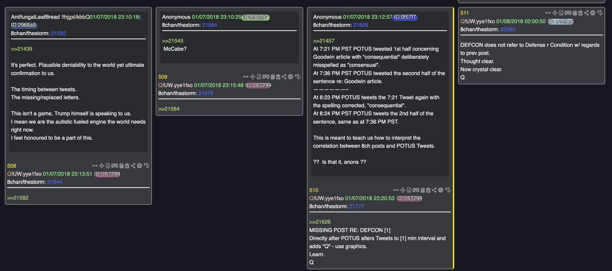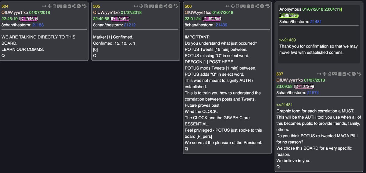 🧵/13- Ok so now that we have Trump having posted the corrected set of tweets, Q then goes on to confirm everything, and I am just going to post all of those drops here for your own reading pleasure, the meaning of them should be clear. (picsrel) but don't leave yet, because there's more and it's actually a new revelation that I believe anons were not meant to find back then, and Q purposefully distracted us from it. But it's a future proves past that will blow your mind😎 (note: drop #510(pic4rel) anon says PT, his timing is NOT PT, but actually he is an hour off because if you look at Trumps corrected tweets that are actually still up (I will link these in the last posts) you will see that depending on your Timezone you can confirm that he is in fact an hr off.