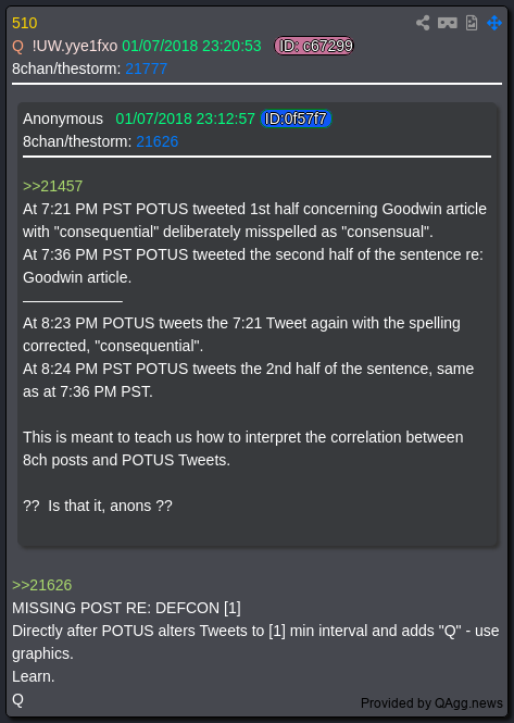 And it happened and anons did what anons did and the theories and takes ran wild, and as such the subject of the gap between the the two sets of tweets came up, logically wondering if the gap between the the first set of tweets with the misspelling and the second set of corrected tweets, was also something important to look at, but then in the midst of putting all the pieces together, and the following Q drops only pointing to the gaps between each set, and not between the actual sets, Q dropped post #510(picrel), where he confirmed what had happened via the anons post, while pointing out that ALL anon missed was the defcon1 [1] marker for the second tweet time in the corrected set of tweets. So believing we had found all there was to find, that was the last i thought about it until Stormy made me go back and look with that "reminds me of these posts" comment the other day, and wow... here it comes...continued...