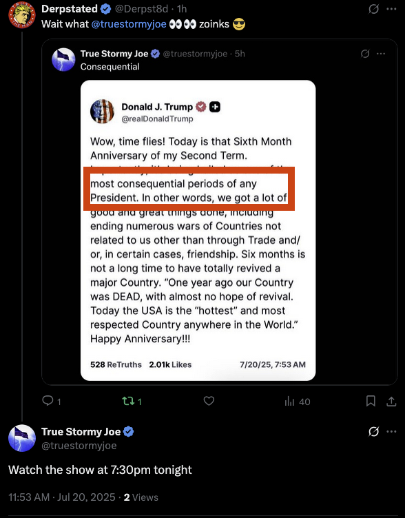 🧵/18- Now remember the quote is about Trumps presidency being an enormously consequential presidency, and while it was enormous i think that this is actually the Most consequential presidency, his second Presidency...the 47th Presidency of the United States of America and in the NEXT post I will show you something that just happened the day after a convo where Stormy and I were talking about this in a thread and i had Dm'd him re a Trump post he alerted me to about it, cause Joe sees that kinda sheeit 🫡