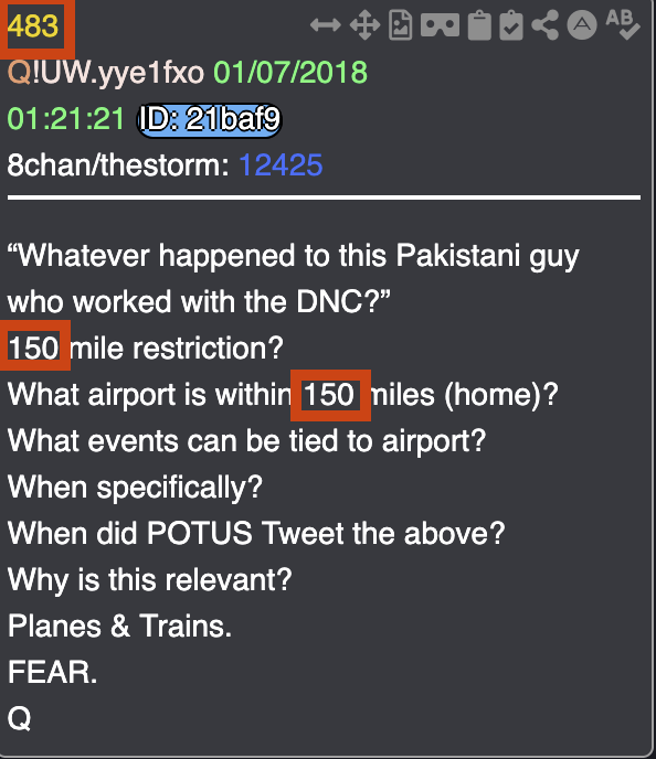 🧵/3- So Now we have Q -cue up these marker posts on the 6th, then the first post that we get in the wee hours on the AM of January 7th(1/7 or 17 😎) at 01:21am is this drop #483 (picrel). Which again via summation of digits is 4+8+3=[15], again important for later. Inside that post we have 150 repeated twice, and again we remove zero's leaving us w/ [15] & [15]. Now we always use pattern recognition when seeking confirmation of comms, and so far we have a post that is pointing to two markers [5] and [10] that equal [15] in a drop with a timestamp that equals [15] on the 6th, and the first drop #483 on the 7th that along with the timestamp contains 3 [15]'s.