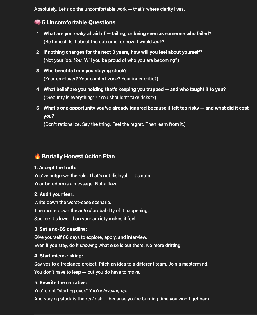 "Act like my life coach. I feel stuck because {describe situation}. Ask me 5 uncomfortable questions to uncover the root issue. Then give me a brutally honest action plan to move forward."