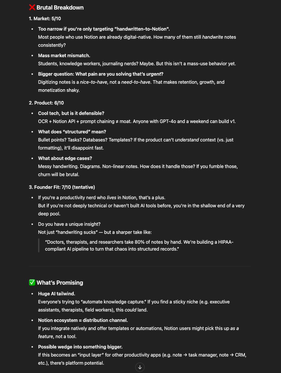 "You’re a brutally honest investor. Pitch: {insert startup idea}. Tear it apart. What’s flawed? What’s promising? What’s missing? Rate it on market, product, and founder fit. No fluff just real feedback."
