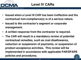 "A Level III Corrective Action Request (CAR) issued by the Defense Contract Management Agency (DCMA) is a serious action taken when there are significant contractual nonconformities.