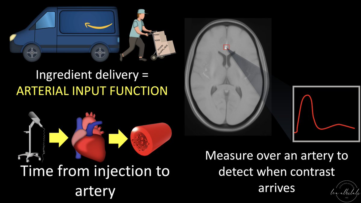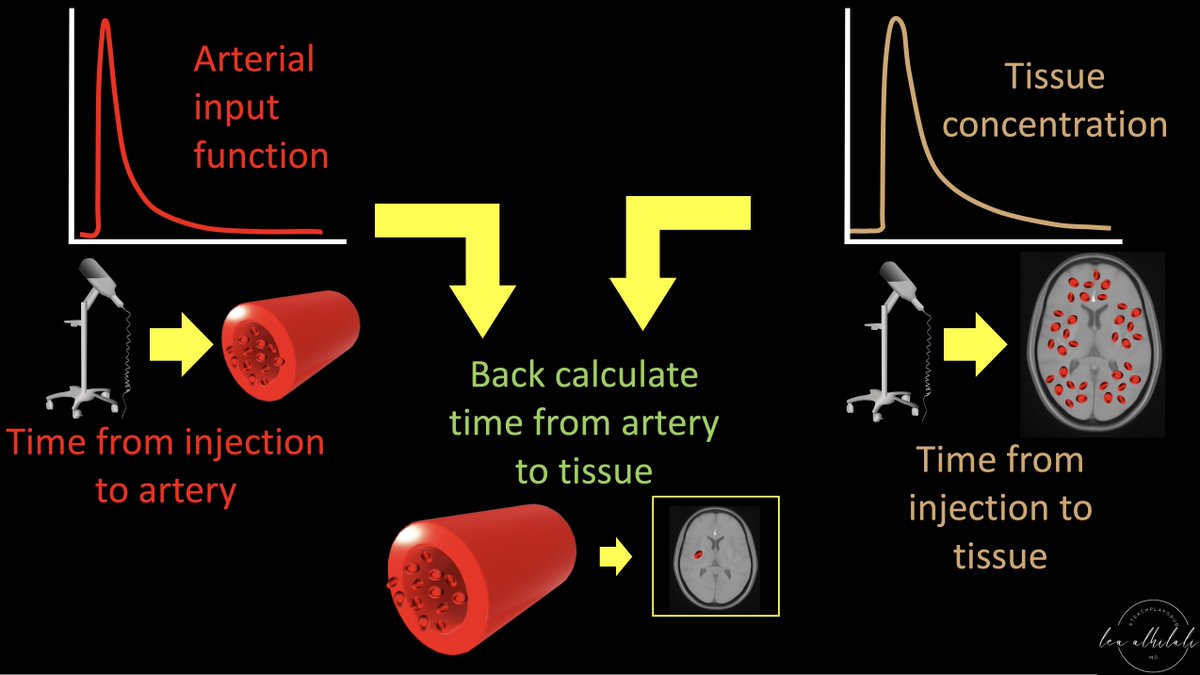 So we use the arterial input function & tissue concentration to back calculate the artery to tissue time