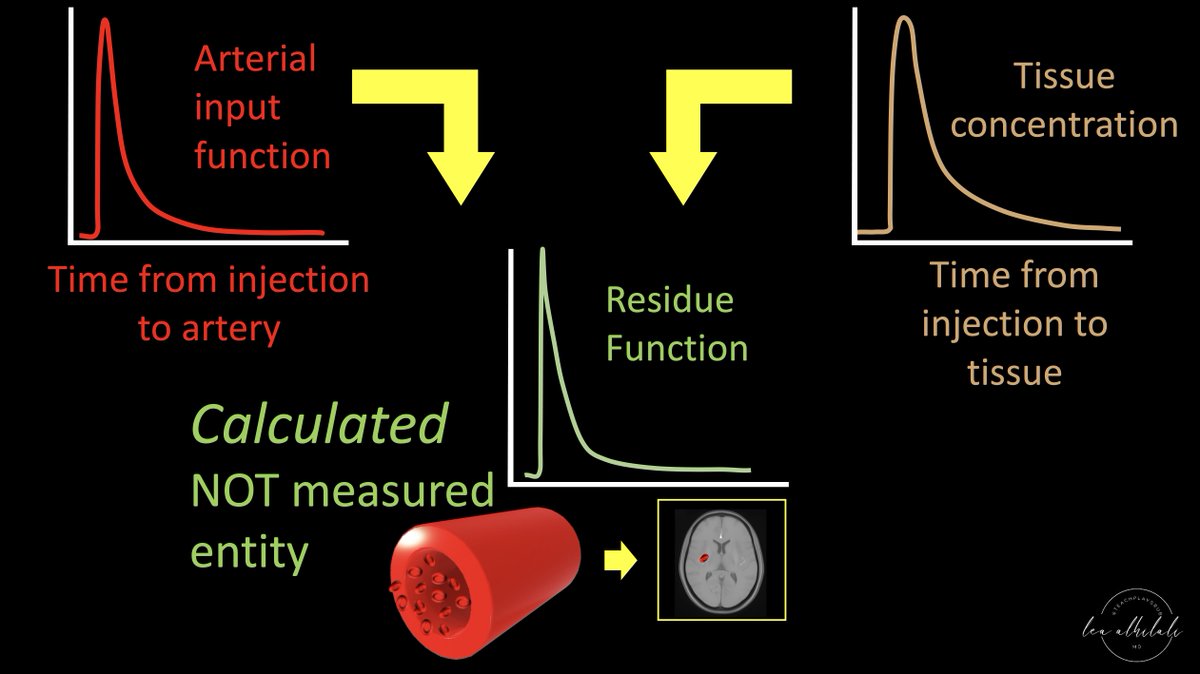 This back-calculated function is the residue function—it’s not a real measurement in the brain, but a calculated entity