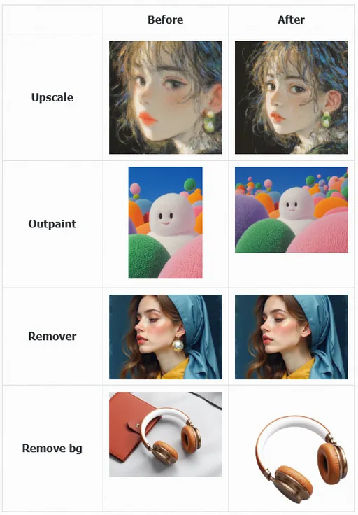 What editing tools Lovart has: Upscale, outpaint, crop, remover, and remove background.