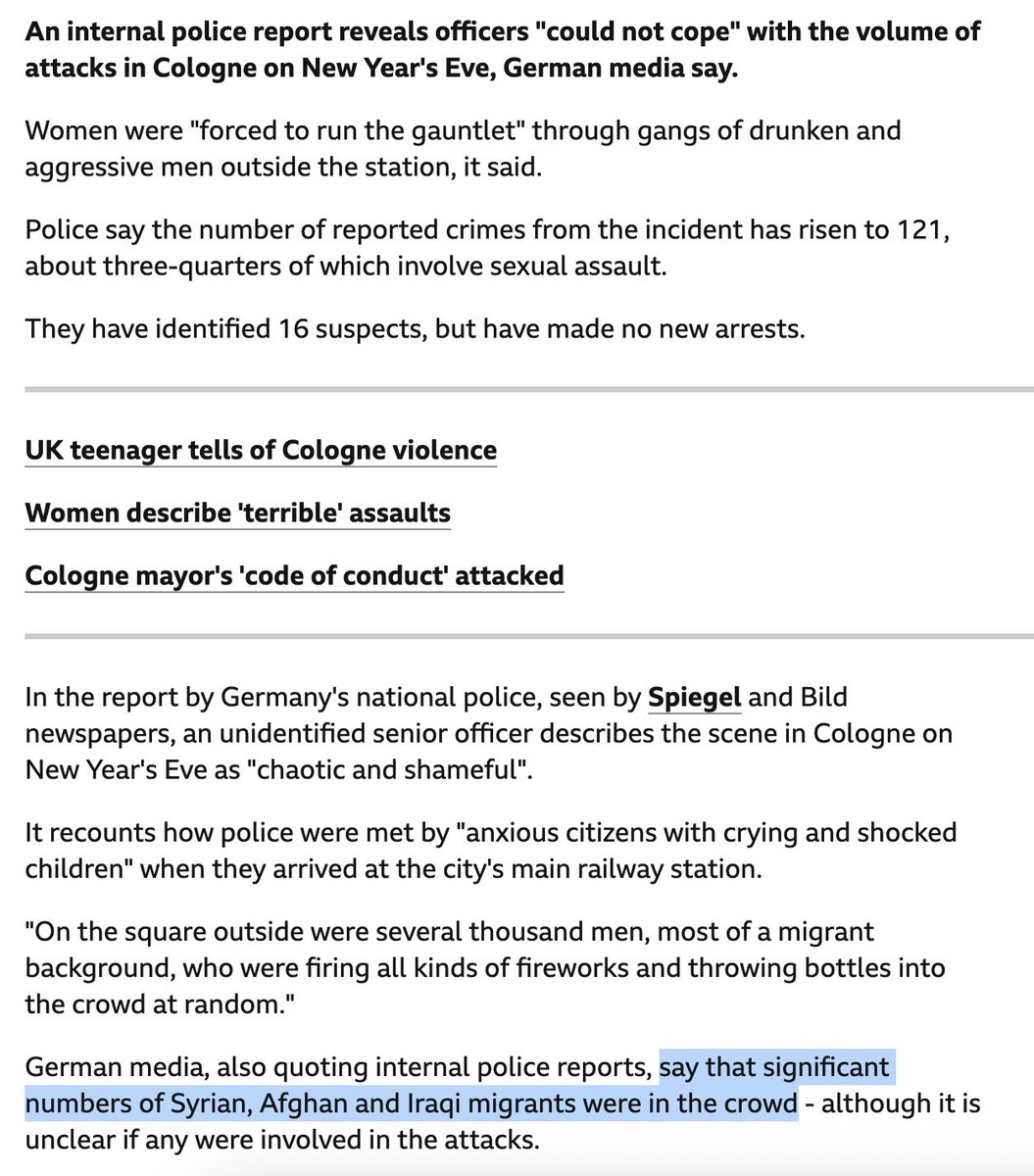 6. On New Year's Eve 2015, over 1,200 women were sexually assaulted in Cologne by groups largely of North African and Arab migrant origin. Police and media initially downplayed the scale and migrant involvement, with reports emerging slowly amid fears of fueling anti-immigrant sentiment.