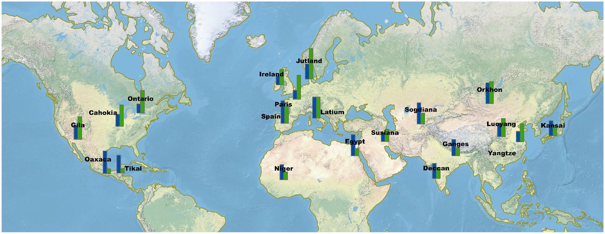The map shows 20 locations worldwide where climate change (blue bars) and societal disruptions (green bars) occurred during the Late Antique Little Ice Age (536–600 AD). It illustrates how volcanic-induced cooling impacted different regions, with some societies experiencing greater social collapse than expected based on temperature change alone, suggesting other contributing factors like political instability or resource shortages. (7/14)🧵