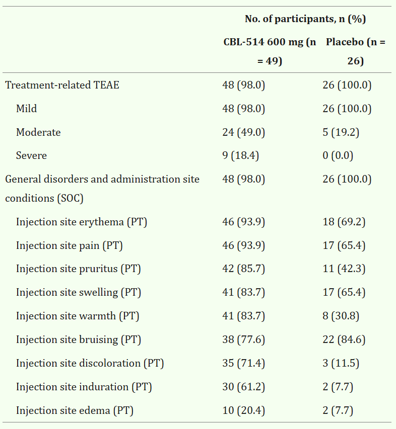 The action of CBL-514 seems to be entirely local: no systemic side effects, and no adverse effects beyond what you'd expect from giving people large injections