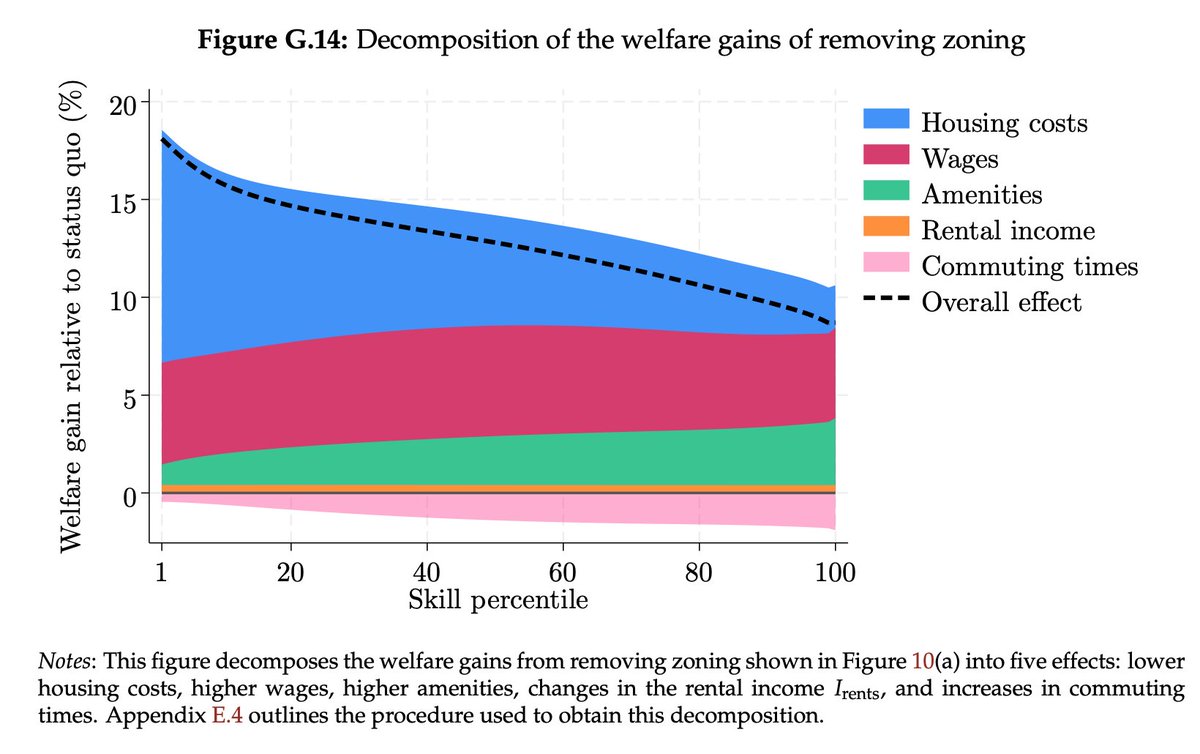 Low-income households would benefit primarily through lower housing prices, whereas households higher up the ladder would benefit more via endogenous amenities & wages.