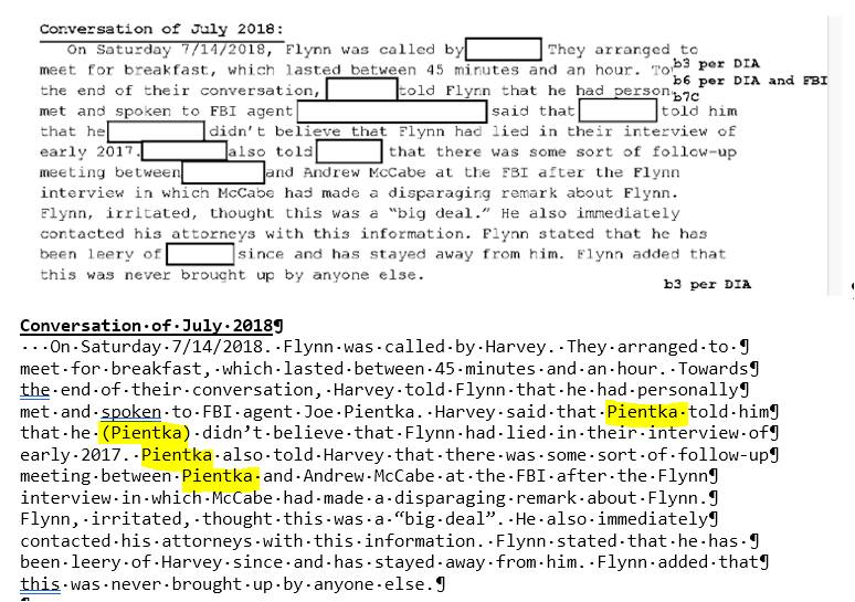 in the FBI 302 referenced above, Pientka can be easily identified as the FBI agent who told Harvey that he didn't think that Flynn had lied in their interview. As has been discussed at length in the past, the interview transcript showed that Flynn was asked about expulsions, but not about //sanctions//. Flynn pled guilty to lying about discussion of "U.S. Sanctions" - a defined term related to one of the executive orders.