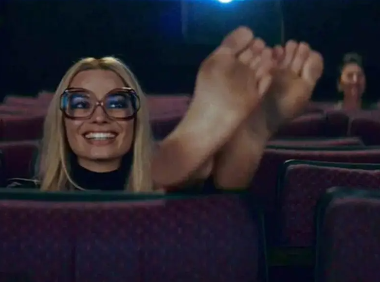 We see Robbie’s bare feet (a QT trademark) when she puts them on the seat in the cinema. In real life, Tate would often go out in public wearing no shoes and even wear bands on her feet to look like sandals. This is why Tarantino asked Robbie not to wash her feet.
