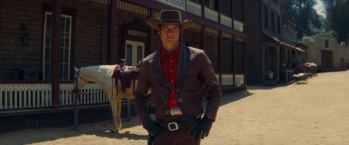 A QT regular has an appearance too. Michael Madsen shows up as Sheriff Hackett in Bounty Law. And the yellow Cadillac we see is Madsen’s. It’s the same one we see in Reservoir Dogs. Check out the Wilhelm scream too…