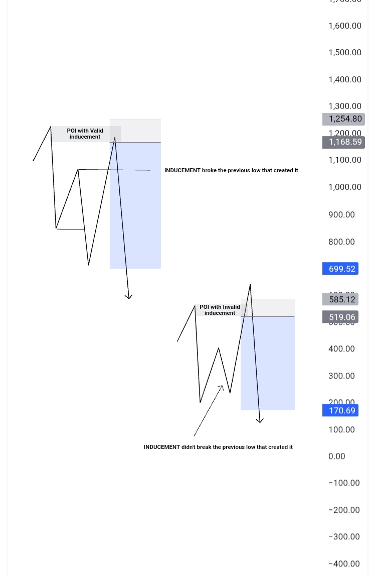 For an inducement to be valid, it must break the previous high or low that formed it and be located near a point of interest.