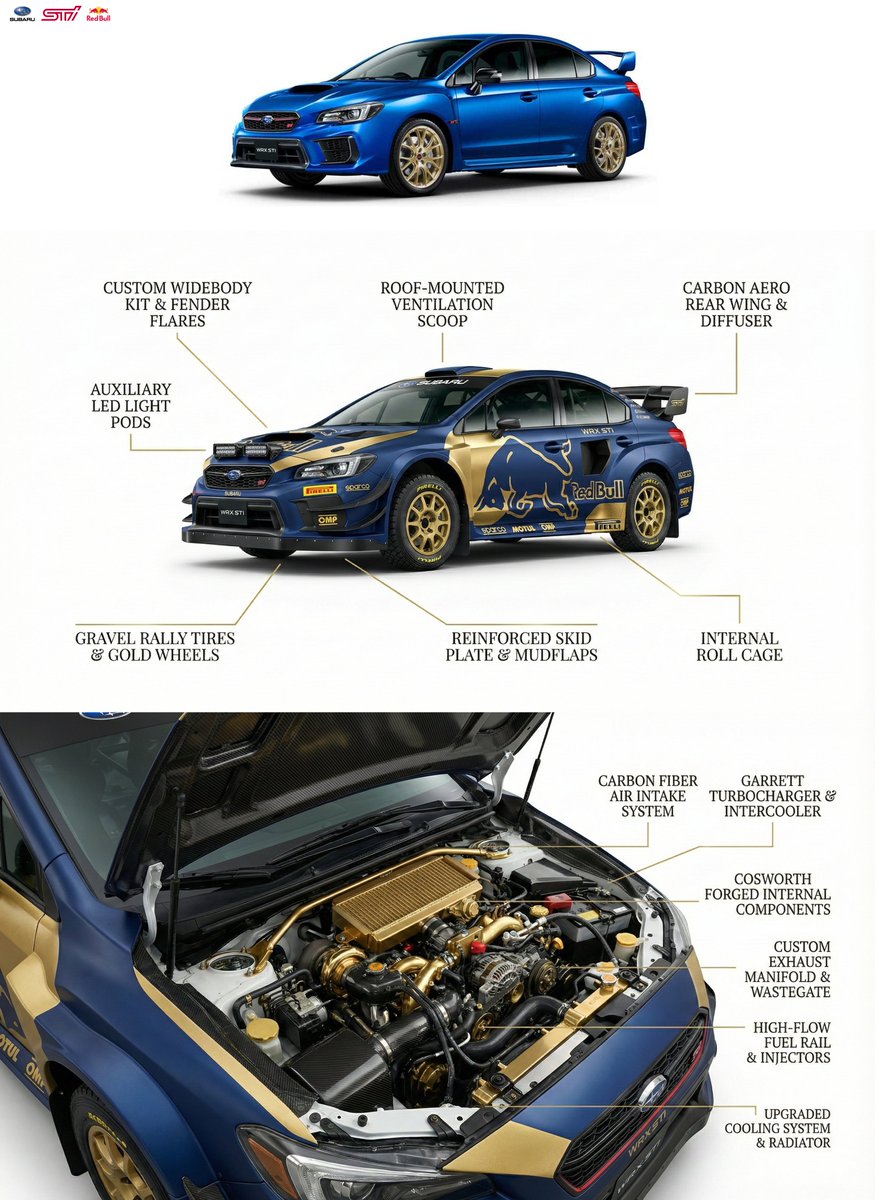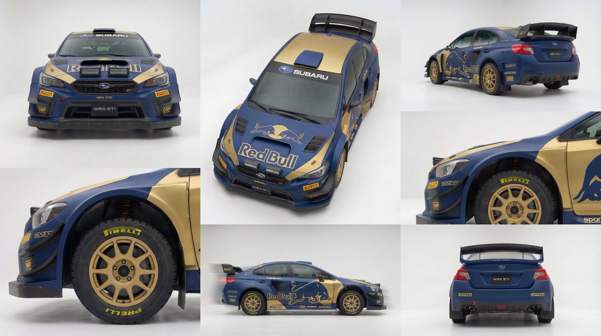 Keep the Subaru WRX in the exact position, perspective, and placement in the white studio environment. Modify the car to upgrade it - Making rally racing performance modifications with a wide body kit . Take it an extreme level of detail and craft. Label each performance modification you make to the exterior of the car to create a technical diagram. Upgrade the exterior branding and paint to represent Red Bull. Immaculately design the exterior making it a branding masterpiece of creativity mixed with bold expression.