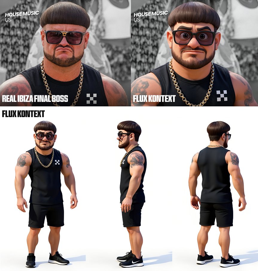 full body [front view, side profile, rear view] shot of this exact character. standing in a white studio. Black shorts. Black sneakers. Overly wide musclar body.