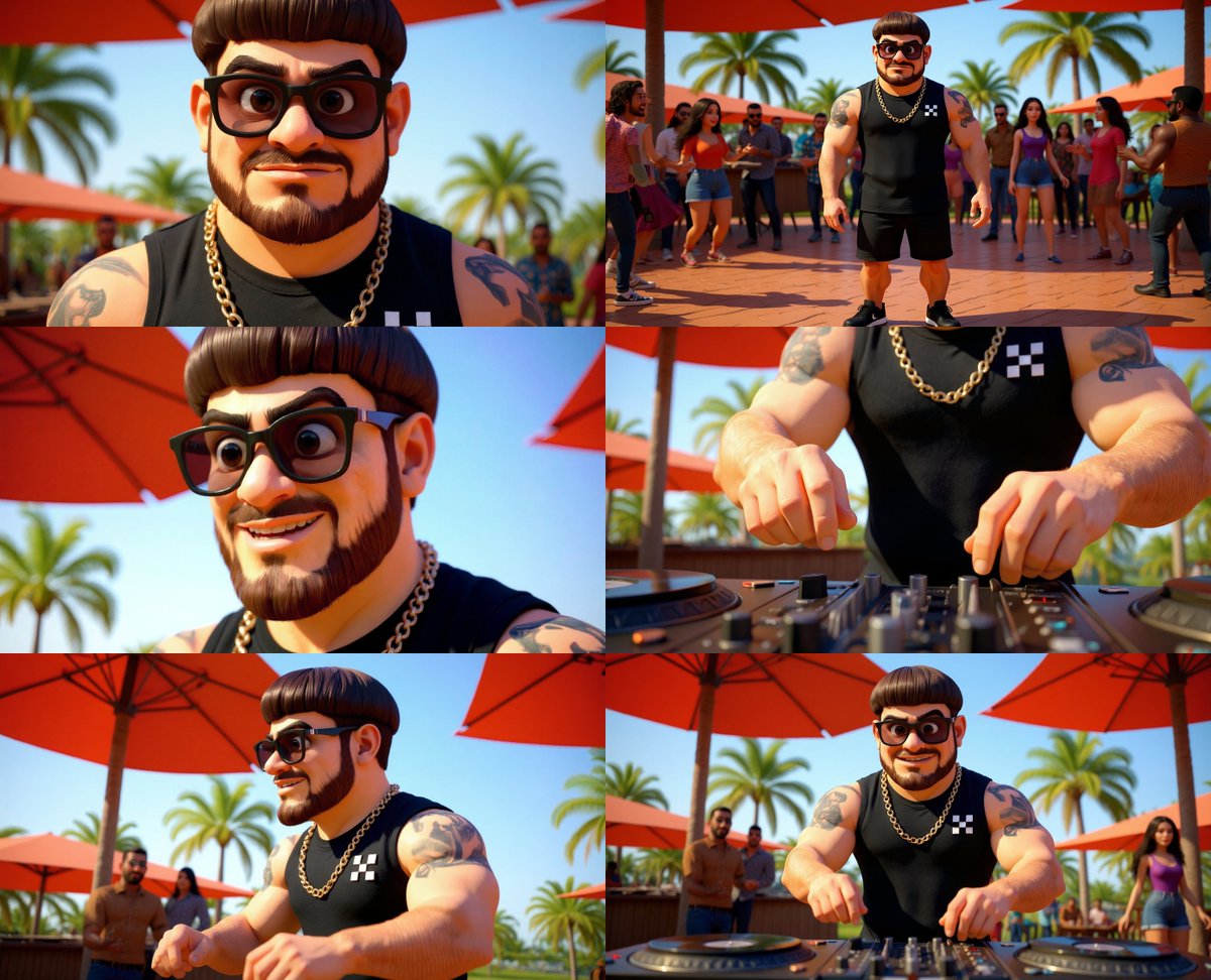 This exact character standing in open air dancefloor at an ibiza club surrounded by other people dancing with a DJ booth in the background. Pixar style. Daytime, overhanging shades palm treese in the breeze.