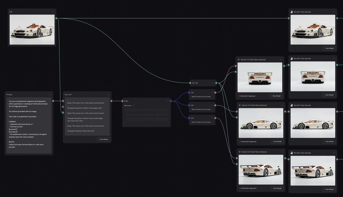 PROCESS: 01. Upload car image. 02. Ask for performance + style upgrades 03. Generate multiple angles 04. Ask for lifestyle images.