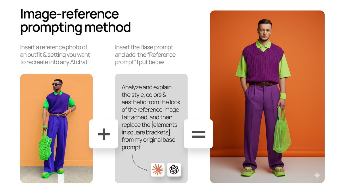 1️⃣ Upload a reference outfit or scene photo to any AI chat (ChatGPT, Claude, Perplexity, Grok etc.)