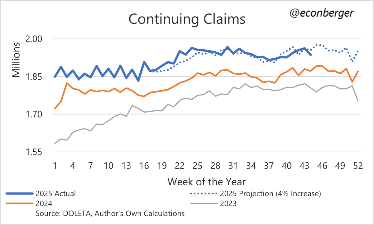 3/ Nothing troubling in regular continuing claims either (week ended 11/01). Modestly above year-ago levels, consistent with the same very slow ongoing deterioration of the past >2 years.