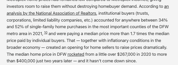 @DKThomp @musharbash_b @NewsLambert The second argument from @musharbash_b is institutional investors from Wall Street are driving up Dallas housing prices, buying between 34-52% of single family homes in key parts of the DFW metro area, outbidding normal buyers.