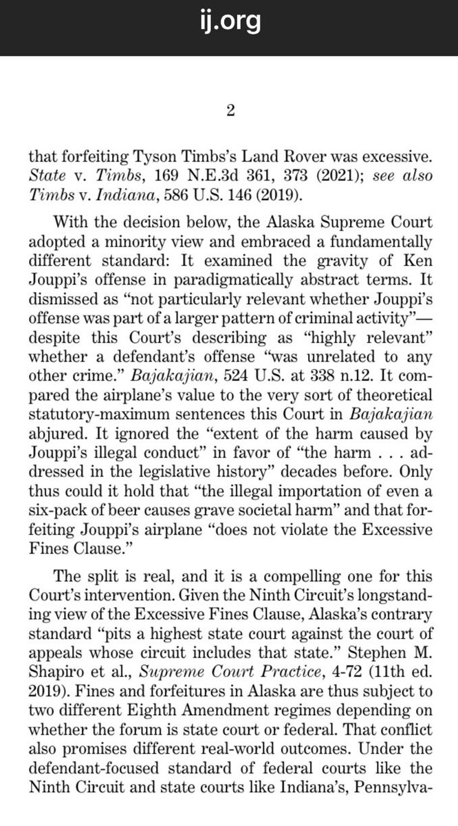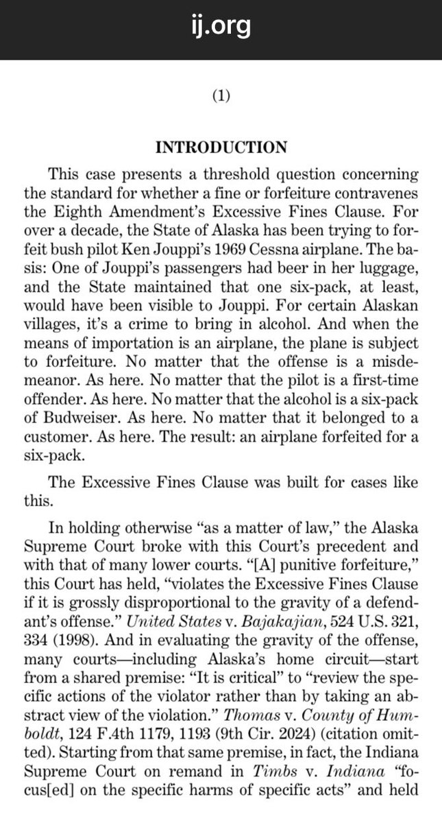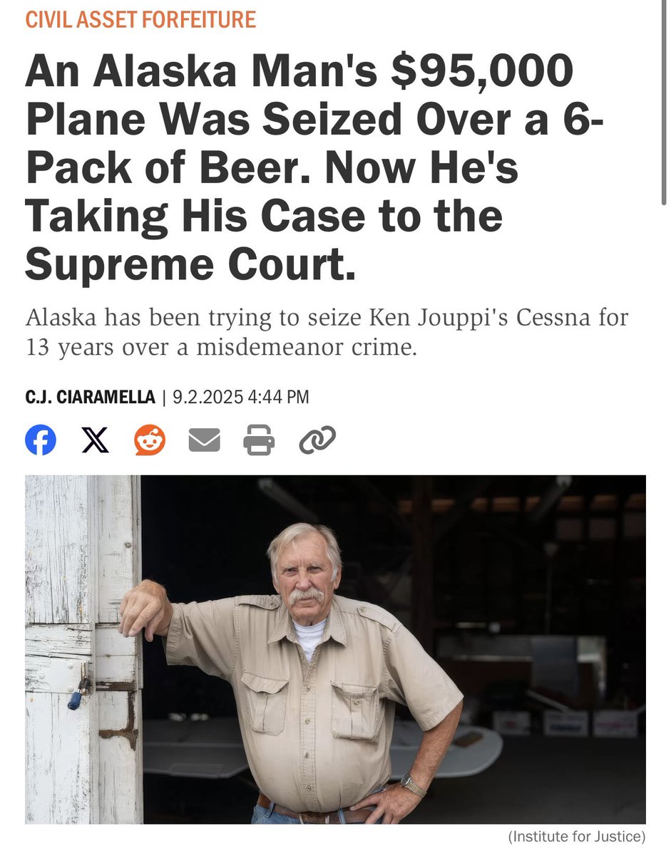 The Alaska Supreme Court’s decision to uphold the forfeiture of Ken Jouppi’s $95,000 💰✈️ Cessna U206D over a six-pack of Budweiser 🍺 is a grotesque violation of the Eighth Amendment’s Excessive Fines Clause 📜 amd a dangerous precedent for property rights nationwide 🏛️.