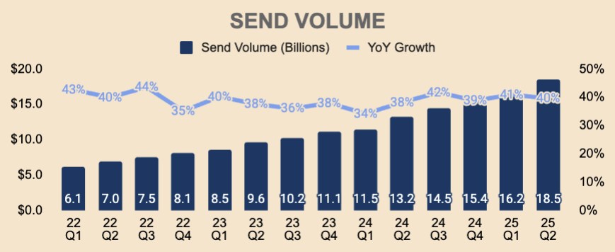 - Send Volume went from $6.1B to $18.5B (41% CAGR).
