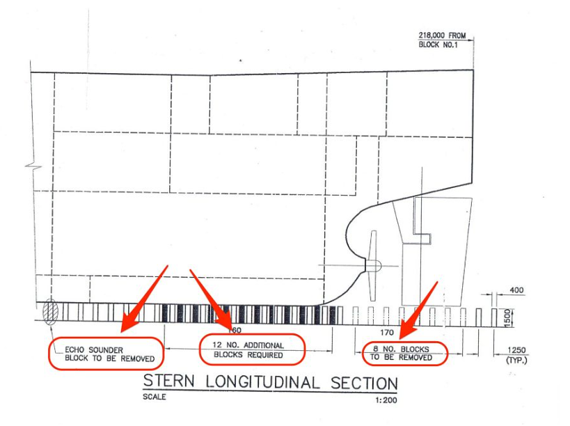 2/x Precise positioning on keel and side blocks is essential to avoid damage or capsizing. Keel blocks are positioned with extreme care. Ships have numerous underwater openings: echo sounders, speed logs, tank drain plugs, sea chests, valves, propeller shaft bearings, etc.