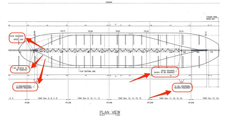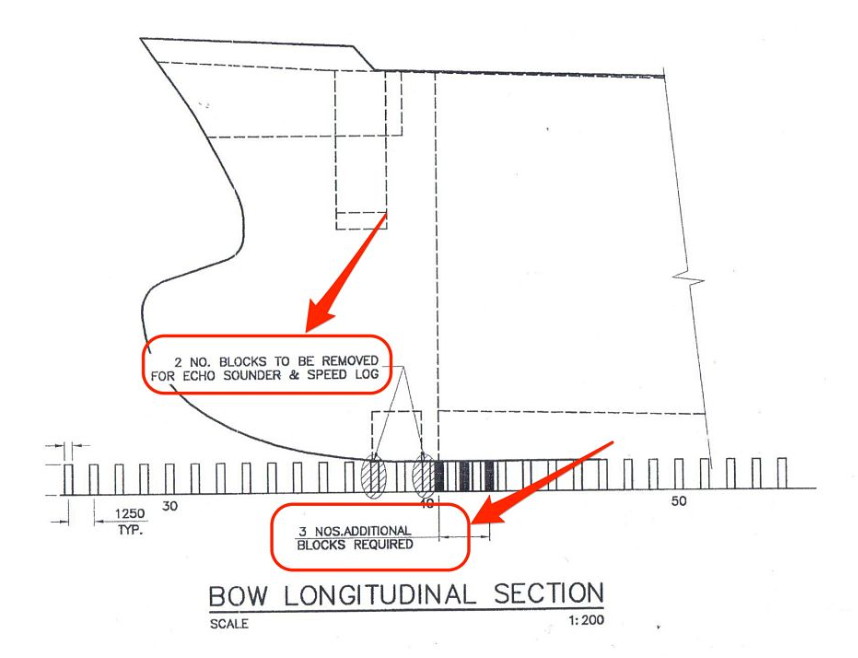 3/x A block under any could block access or cause structural issues when the dock is dewatered. The vessel supplies a "docking plan", detailed drawings showing hull profile, keel line, all bottom openings, protrusions, and shell plating.