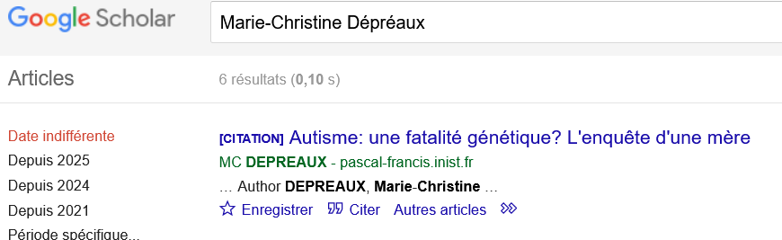 Vous vous en doutez, Marie-Christine Dépréaux a rédigé le nombre incroyable de 0 publications scientifiques relues par les pairs, et n'a aucune qualification permettant de présumer de compétences spécifiques en matière d'autisme.