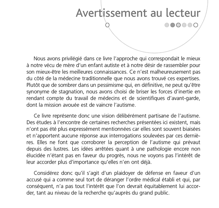 Dans son avant-propos, Marie-Christine Dépréaux revendique un livre qui "correspondait le mieux à son vécu" de maman, de citer "certains scientifiques" en mission pour "vaincre l'autisme", qui "dérangent l'ordre médical", et de ne pas citer les études concurrentes "biaisées".