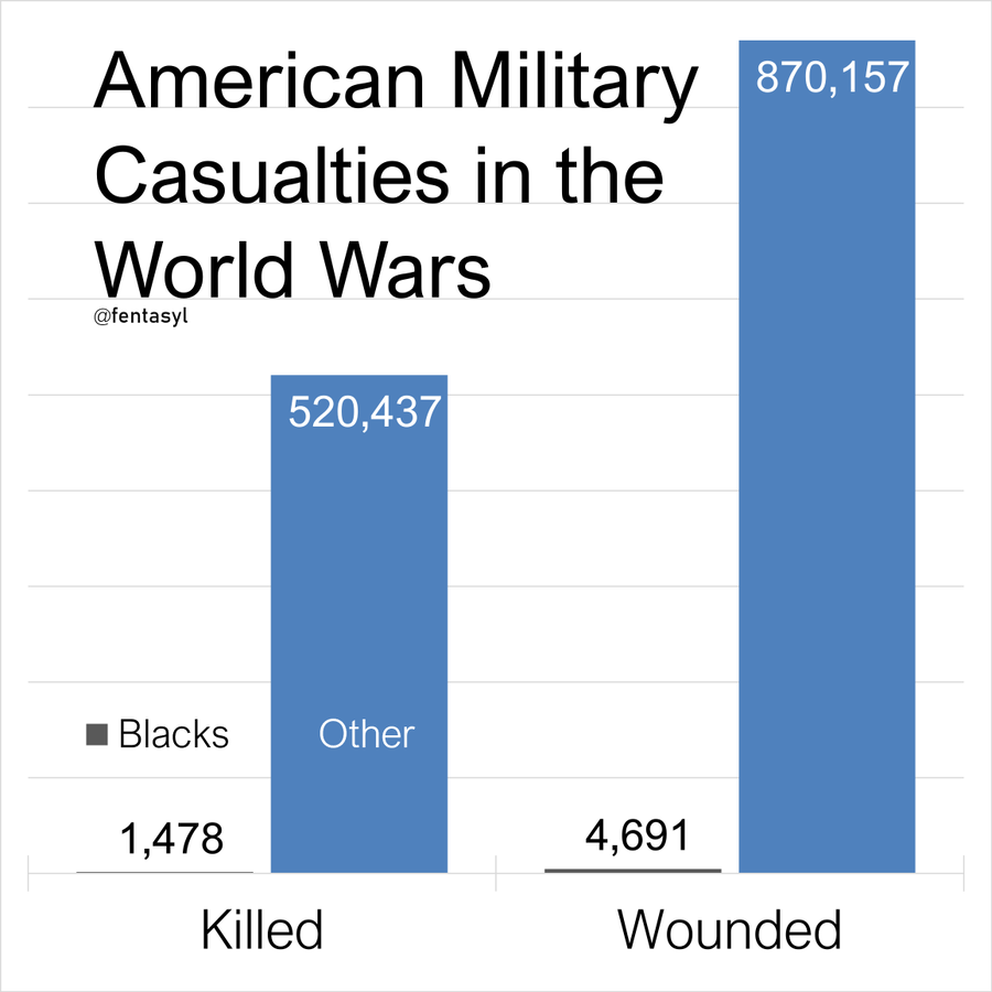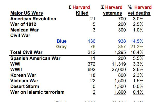Almost as many Harvard students and faculty died in the World Wars as blacks (1064 vs 1478).