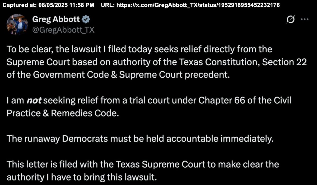 To be clear, the lawsuit I filed today seeks relief directly from the Supreme Court based on authority of the Texas Constitution, Section 22 of the Government Code & Supreme Court precedent.