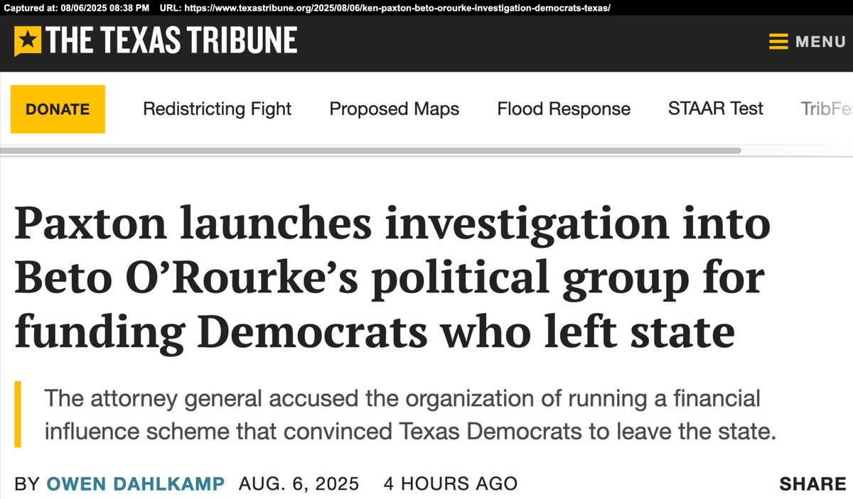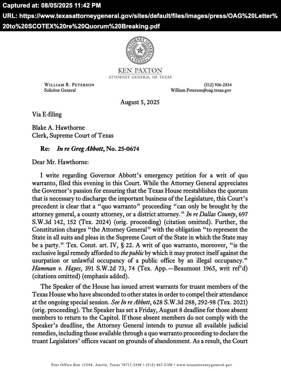 @GregAbbott_TX Attorney General Ken Paxton Releases Statement Regarding Rogue Democrat Lawmakers Who Fled Texas to Break Quorum [04AUG2025]