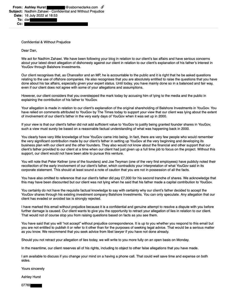 But back in July 2022, Nadhim Zahawi's solicitor, Ashley Hurst, emailed me demanding that I retract my allegation, with the implicit threat of libel action if I did not