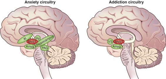 The BNST (bed nucleus of stria terminalis) processes anxiety differently than fear.