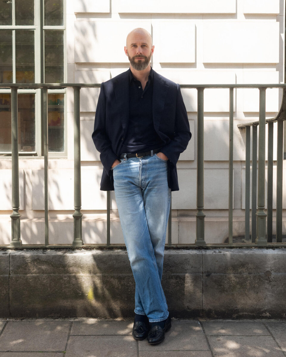 There's a rich history of men wearing tailored jackets, but when they're successful, you'll notice a theme: the jacket is casual (a sport coat, not a suit jacket) and often made from textured materials like tweed. The jeans are slightly higher in the rise and fuller in the leg.