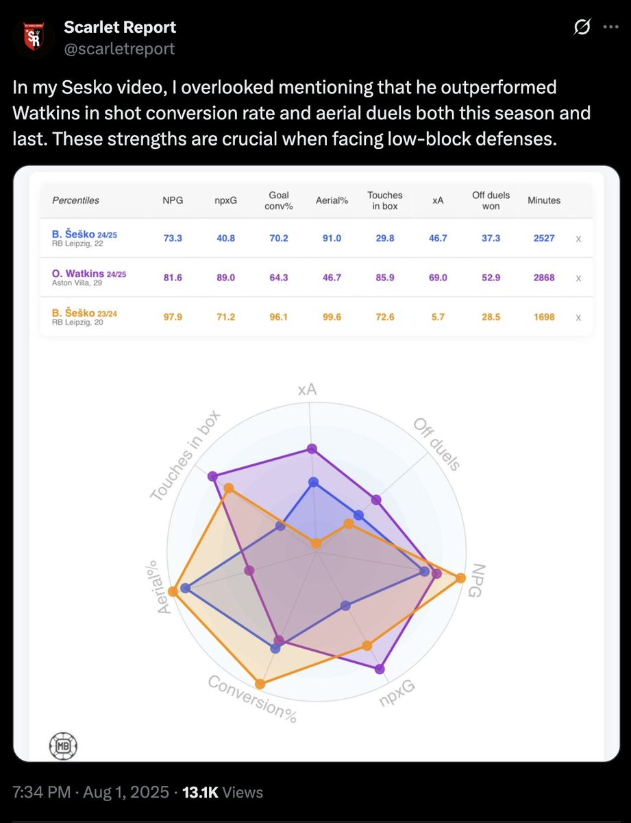 3/ Interestingly, Sesko outperforms players like Ollie Watkins in key areas, notably aerial duels won and shot conversion rate.