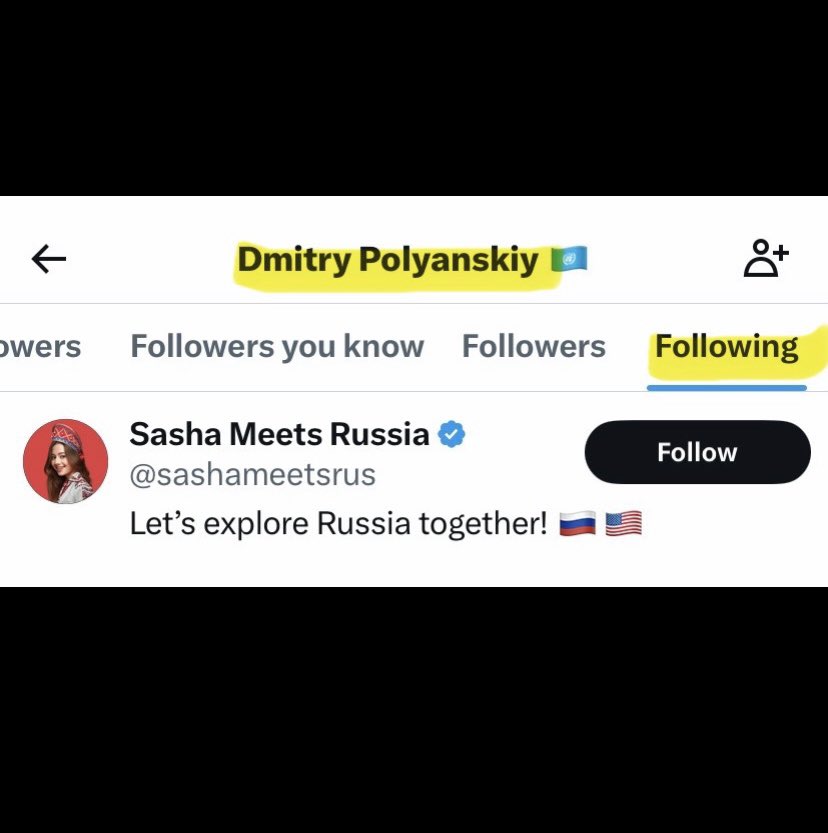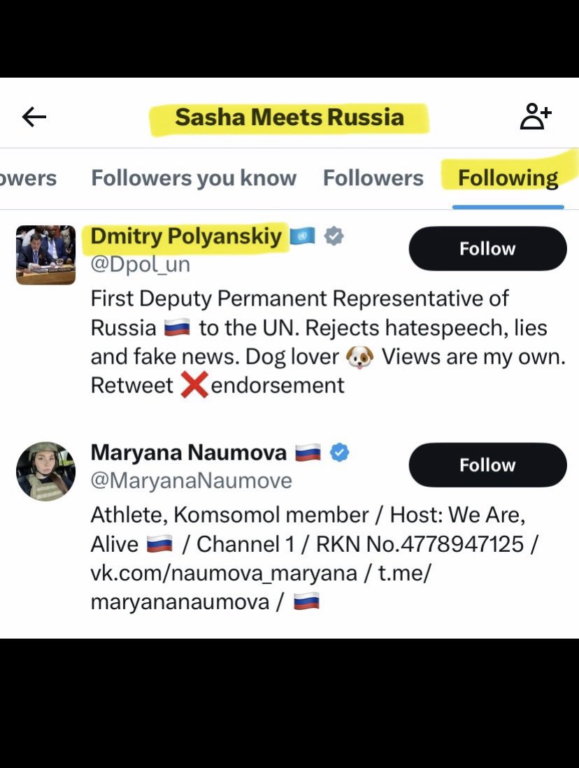 3) She follows Dmitry Polyanskiy and he follows her. This is interesting, because he’s kind of an organizer of American “influencers” that are pro-Russia. He used to be involved with a few of the Russian TEXIT trolls. Let’s continue⬇️