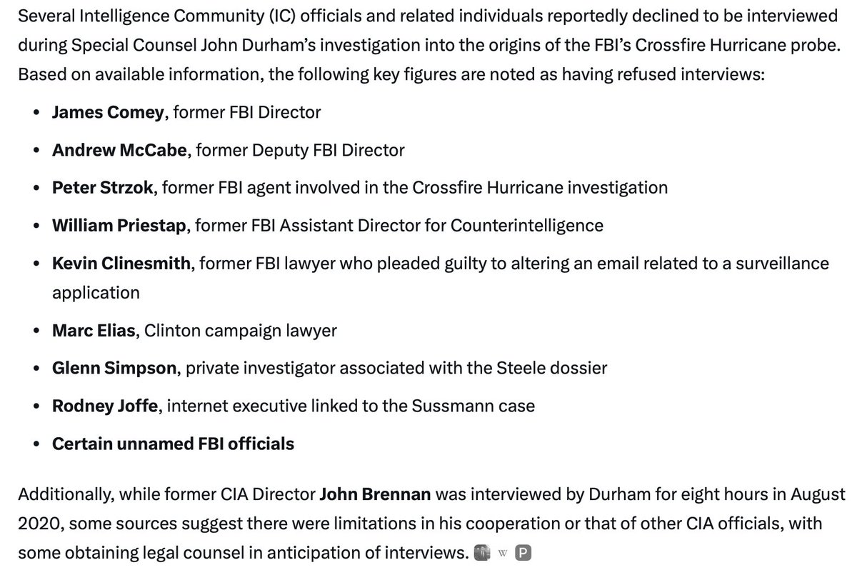2) They also fail to mention that Comey, McCabe and many of the principals with the first-hand, eye-witness information vital to the conduct a full investigation refused to participate: