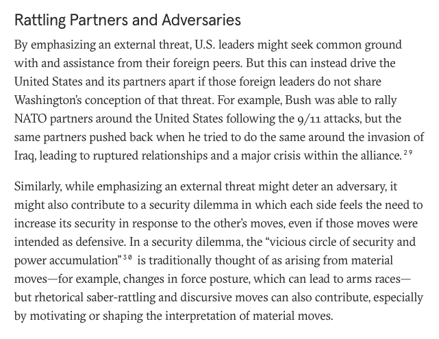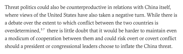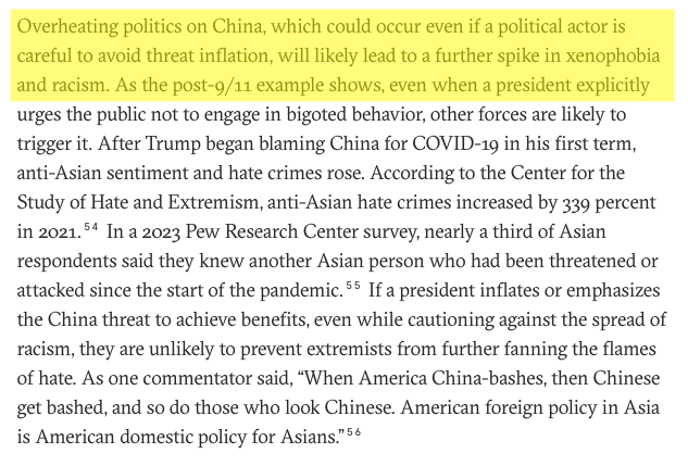 [Slippery slope] 'Threat inflation' is seen as strongly correlated to spikes in 'xenophobia and racism'. From a US-centric perspective threat frames are demonised and its users are painted as reckless or bigoted. The CCP's 'friend-enemy' worldview fuelling conflict is ignored /4