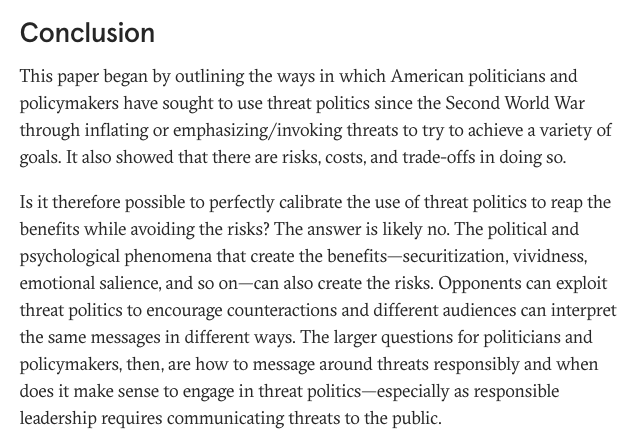 Efforts by politicians to 'persuade through fear appeals' are criticised. Drawing on McCarthy ('Red Scare') and George W. Bush ('Global War on Terror') the costs of 'instrumentalizing threats' are highlighted. The article then pivots to the case of China, but fails to convince /2