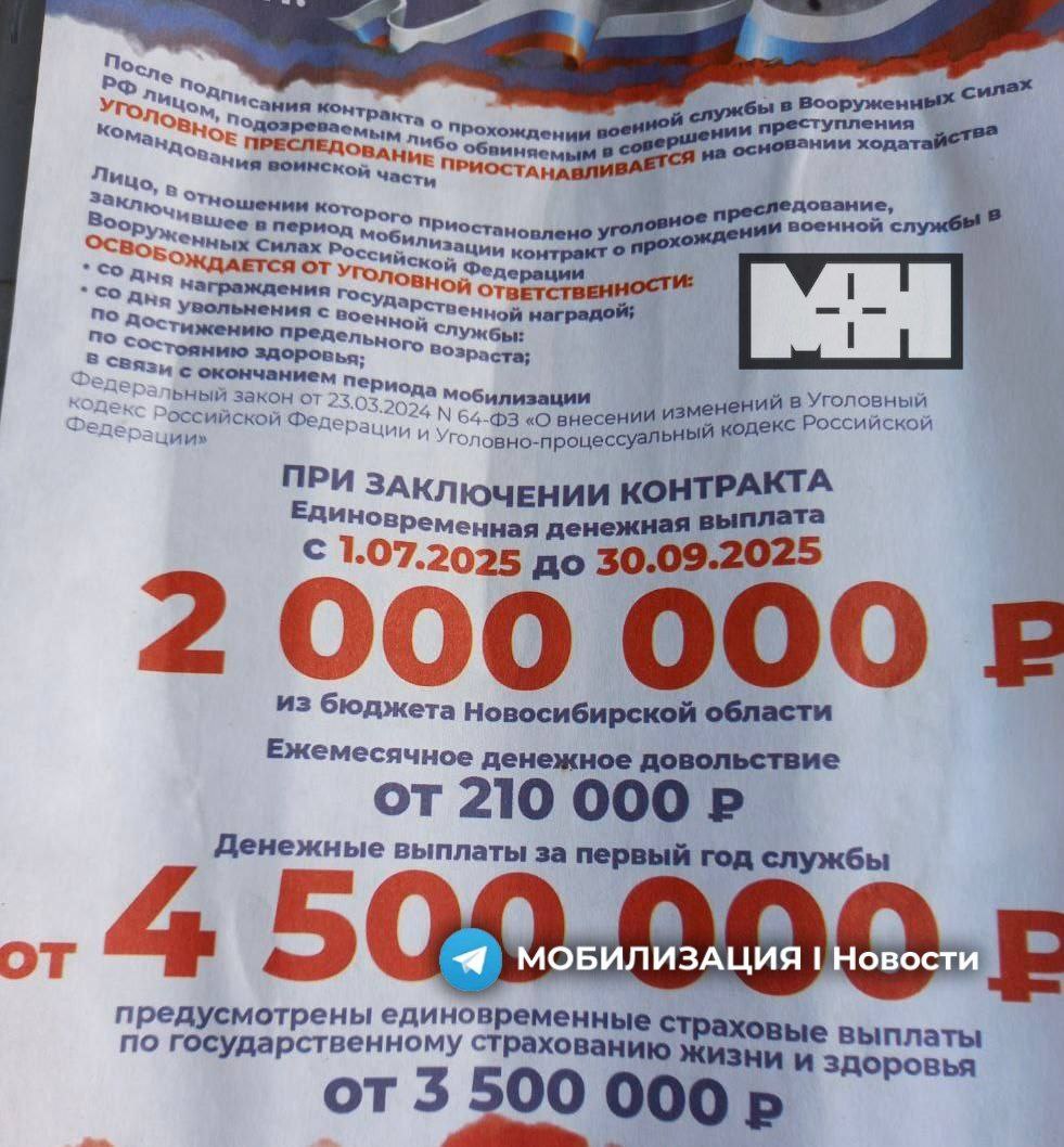 2/ 'Mobilisation News' reports that leaflets are being distributed at bus stops in Russia's Novosibirsk region. They emphasise that one can avoid responsibility for crimes and earn a bonus payment of 2 million rubles ($25,000) by joining the army.