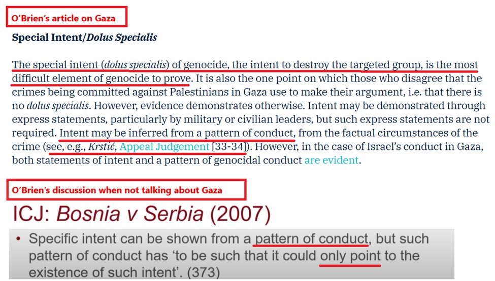 O’Brien invents a new standard for Israel. She says “intent may be inferred from a pattern of conduct” and leaves it at that. But in Feb 2024 she noted ICJ’s much stricter rule—such "pattern of conduct" must "only point" to such intent. That high bar vanishes for Israel. 4/