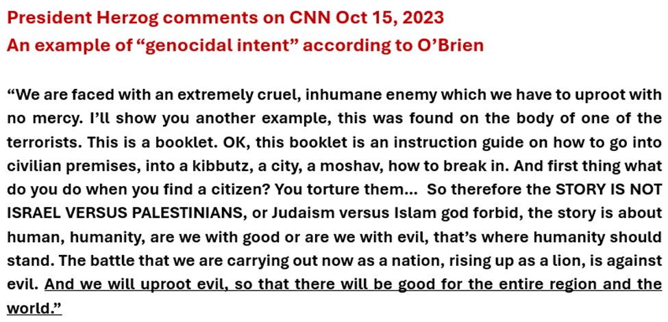To O’Brien, Herzog saying “we will uproot evil” equals genocide. Never mind that moments earlier he said the war is not against Palestinians. His comments (below) focus on Hamas. O’Brien's key source cites vague phrases and strips context to fabricate special intent. 6/