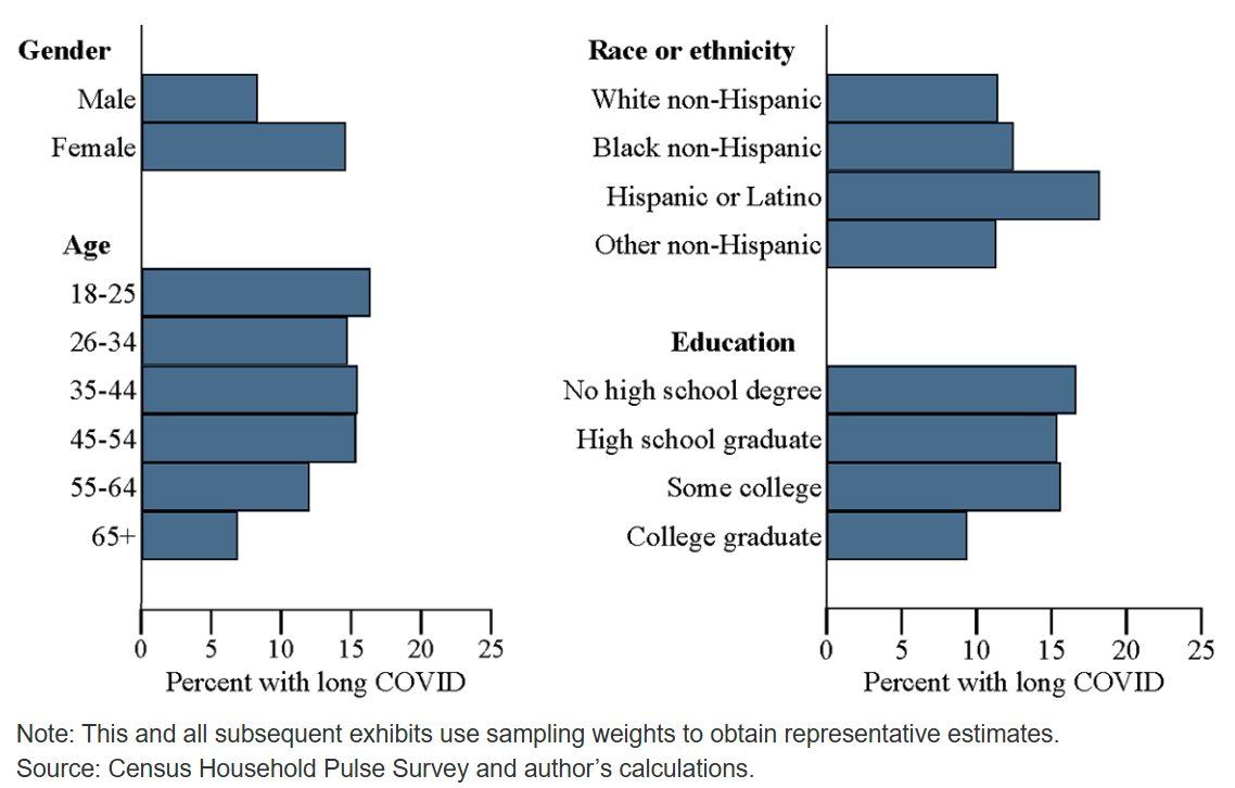 Importantly, in both the ACS—which lacks specific long COVID questions—and in the Household Pulse Survey—which added them in 2022—there's a curious demographic concentration of, first, new disability, and second, long COVID reports: