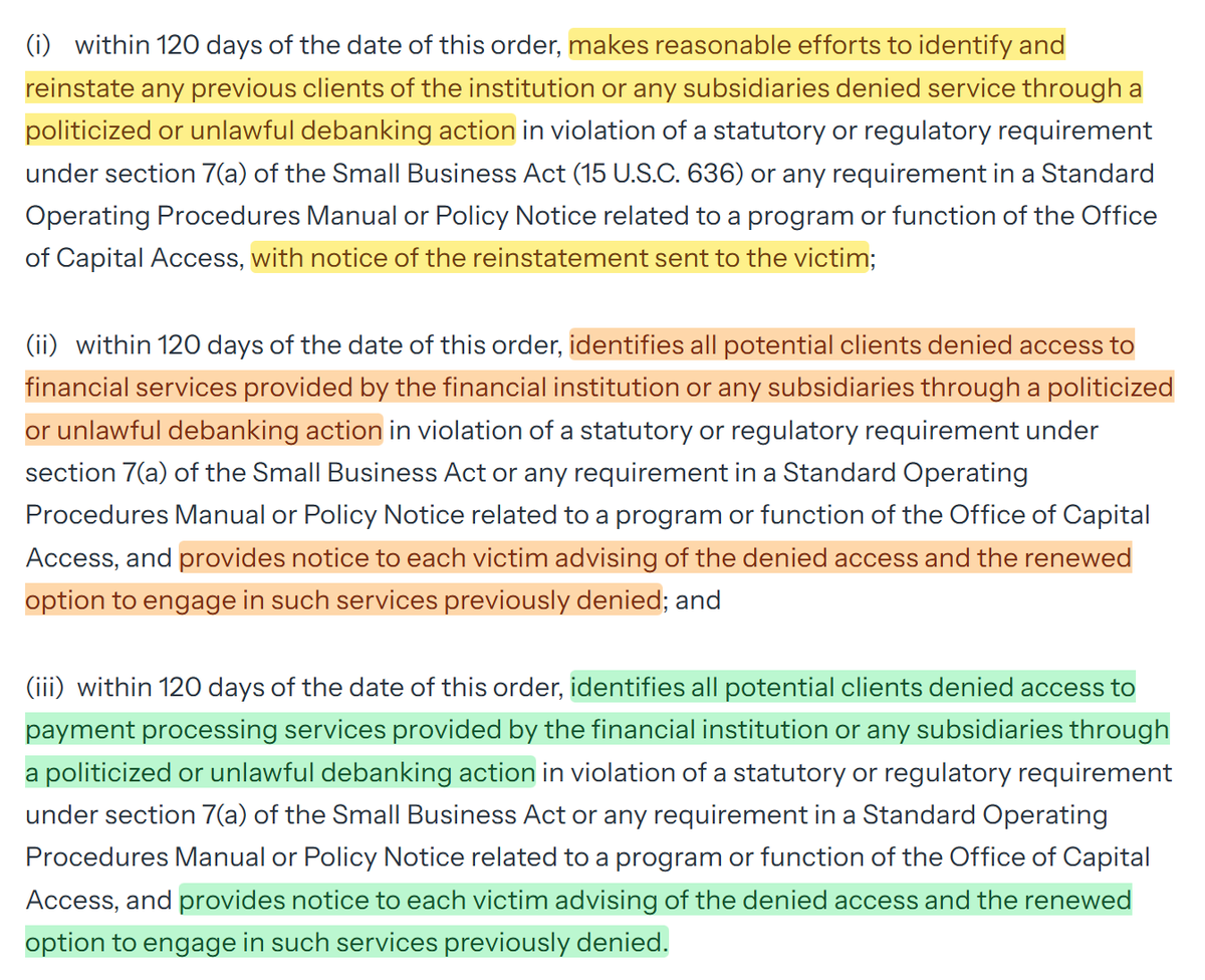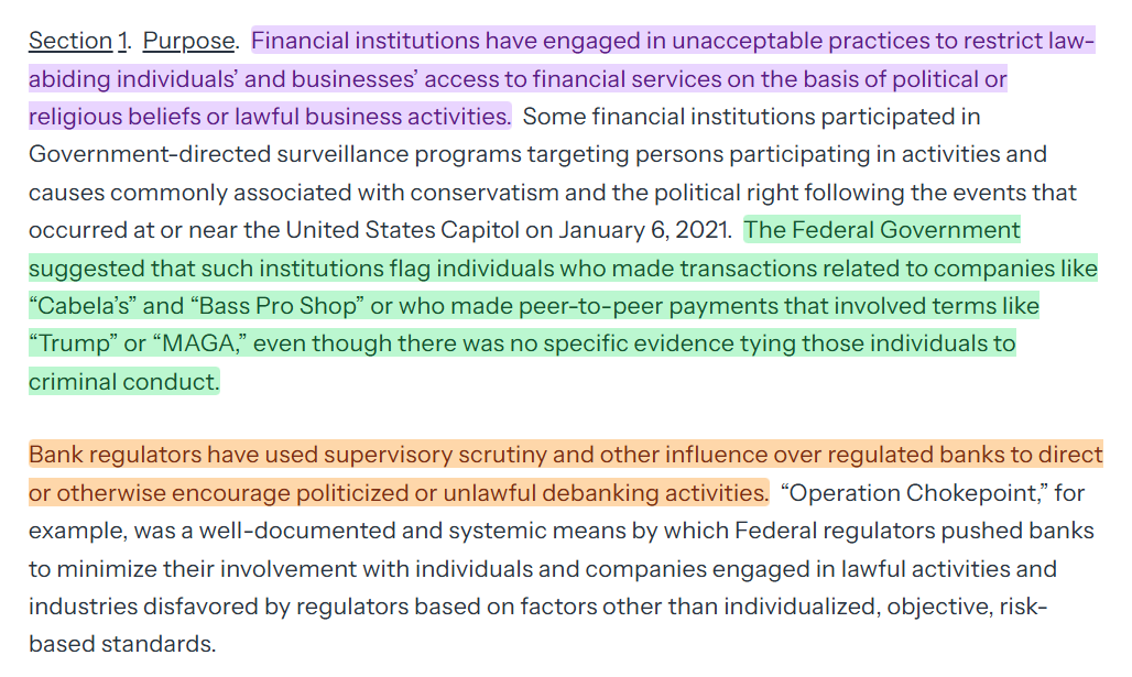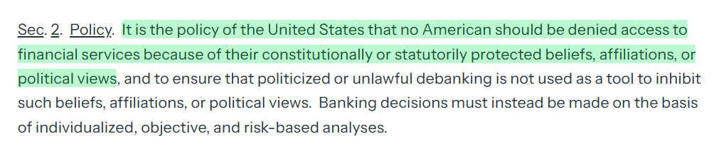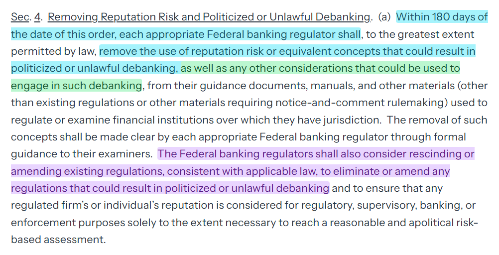 And yes, the original EO includes FDIC, because it's a FSOC member agency. Imagine a bank losing FDIC coverage because they just really want to debank someone. That would be very unwise.