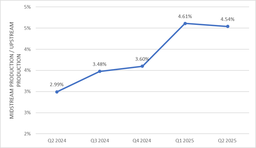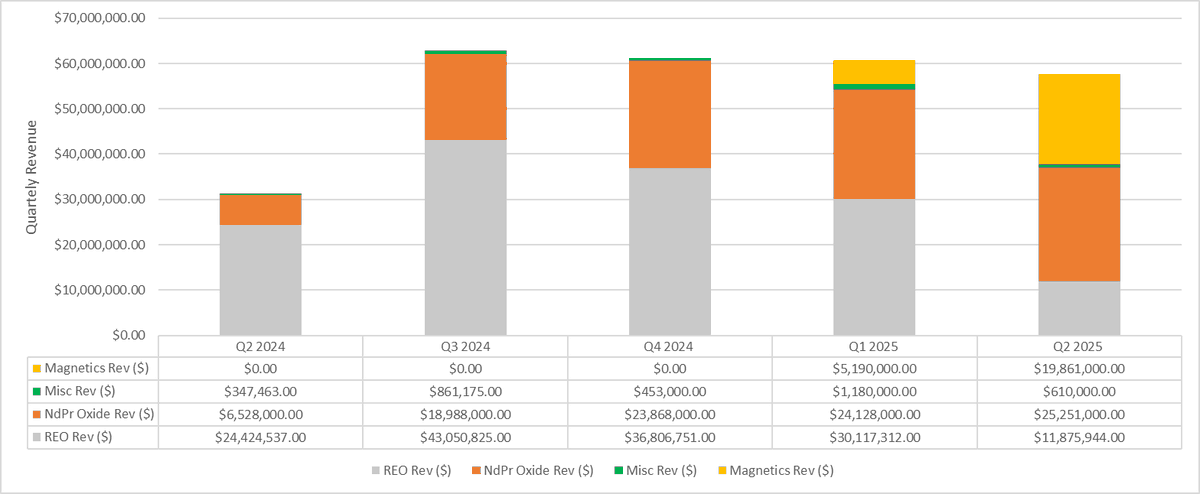 Midstream: Despite planned outages, $MP executed. Highest ever quarterly production at 597 MTs, up 220% YoY. SVs came in lower than I expected at 443 MTs, due to $MP pushing more product through their pipeline. Realized prices per MT were 57$/kg - will move to 110$/kg next Q