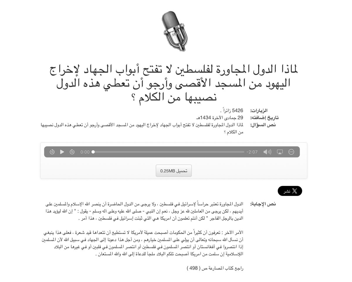 ❝The neighboring countries are considered guards for Israel in Palestine, and there is no hope that the present-day countries will bring victory to Islām and the Muslims by their hands. However, hope lies with those working for the sake of Allāh, the Mighty and Majestic. Yes, the Prophet ﷺ said: “Indeed, Allāh supports this religion even with a wicked man.” But you know that America is the one that established Israel in Palestine — that is one matter. The other matter: you know that many governments have become agents for America, unable to oppose it in the slightest. Therefore, we must ask Allāh, the Exalted, to appoint the best among the Muslims over their affairs. It is for this reason that we have called for jihād in the path of Allāh: because if the Muslims are victorious in Afghanistan, or if the Muslims are victorious in Palestine, or if the Muslims are victorious in the Philippines or in any other Islāmic country — if those countries are spared from America’s influence — they would become sanctuaries for the callers to Allāh. And Allāh is the one whose help is sought.❞