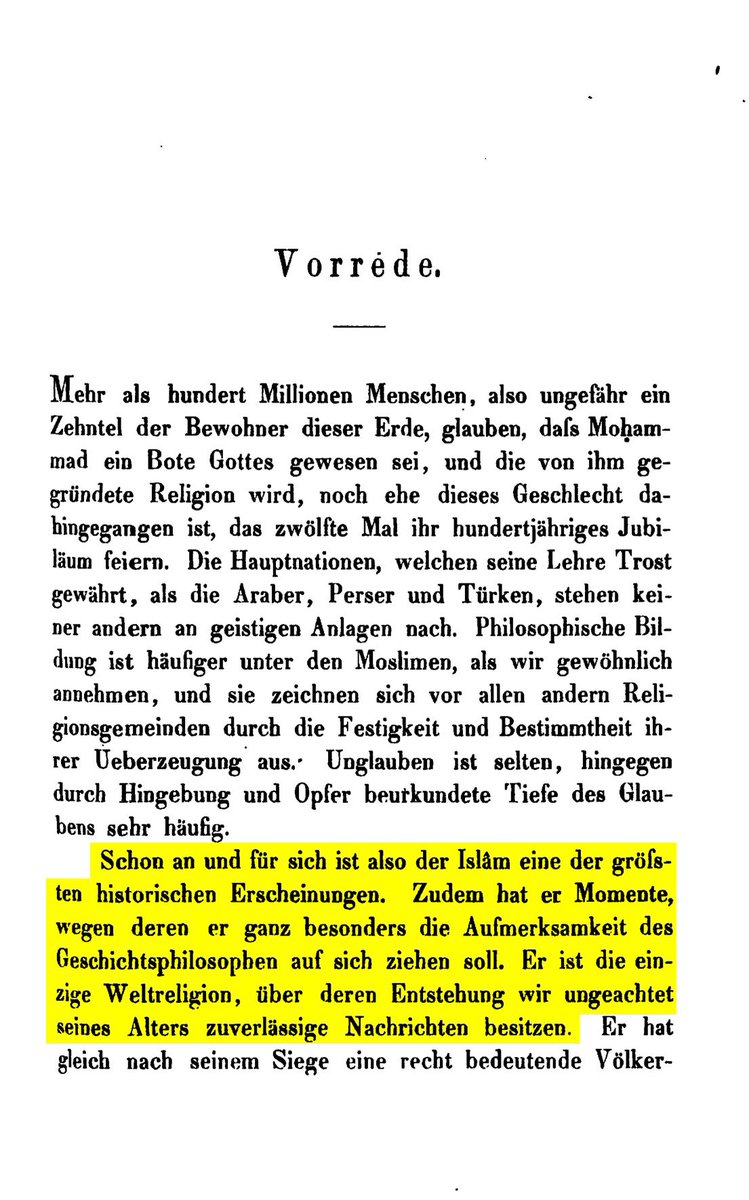 ❝Even in and of itself, Islām is therefore one of the greatest historical phenomena. In addition, it contains elements that should particularly attract the attention of the philosopher of history. It is the only world religion about whose origin we possess reliable reports, despite its age.❞